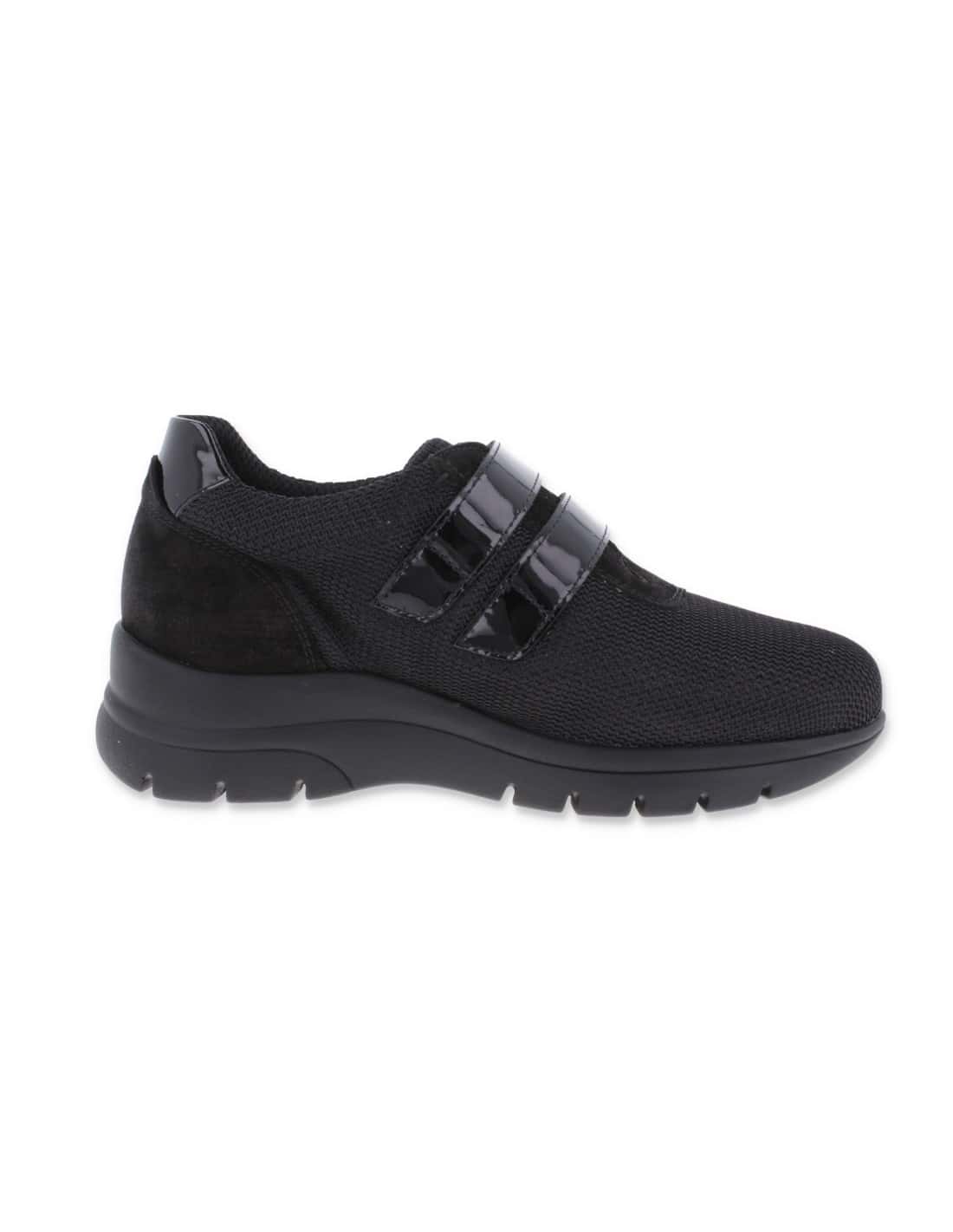 ISI BLACK, WOMEN SHOE MESH FABRIC AND LEATHER, LARGE WIDTH. Adjustment with double straps. Suitable to adapt custom insole, manufactured with the best quality materials. Indicated for women who need a shoe comfortable, spacious and adaptable. Seams internal are protected, avoiding chafing and protecting the most sensitive and delicate feet.