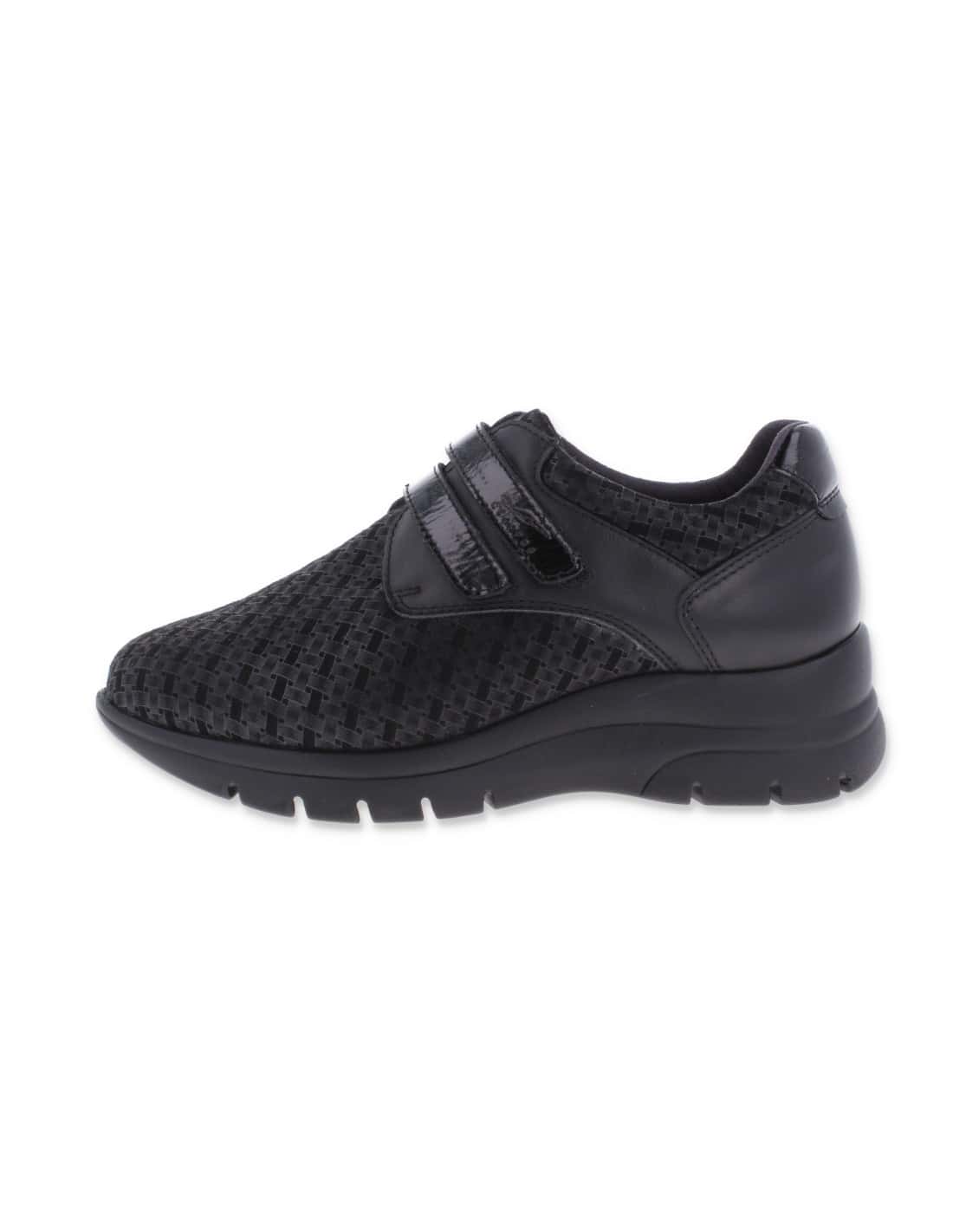 LIDIA BLACK, WOMEN SHOE LYCRA AND LEATHER, LARGE WIDTH. Adjustment with double straps. Suitable to adapt custom insole, manufactured with the best quality materials. Indicated for women who need a shoe comfortable, spacious and adaptable. Seams internal are protected, avoiding chafing and protecting the most sensitive and delicate feet.