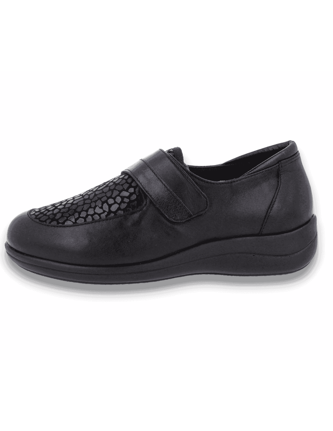 Lady shoe COMODON 2022 01 Black, leather and lycra elastic adaptable. Adjustment with strap on the instep. Suitable to adapt custom insole , manufactured with the best quality materials. Indicated for women who need a shoe comfortable, spacious and adaptable. Seams internal are protected, avoiding chafing and protecting the most sensitive and delicate feet.