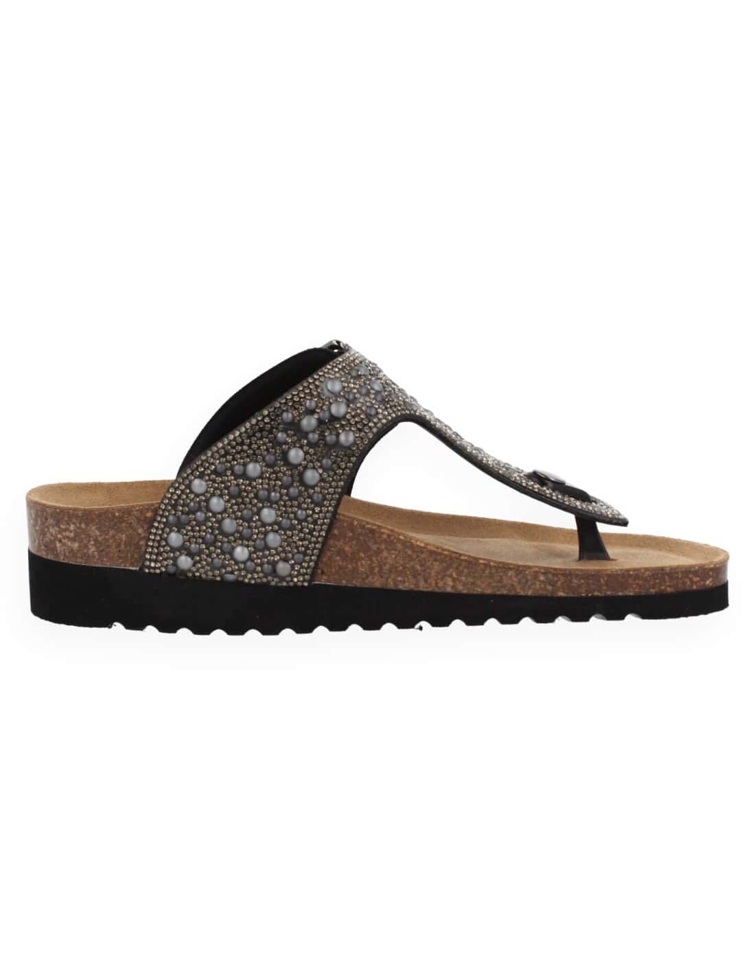 GEMMA BLACK COLOR FLIP-FLOP, made with napa leather. Instep adjustment with buckle. Anatomically stabilizing cushioned insole with EVA, lined with natural microfiber, and molded with suitable anatomy for optimal foot support. With its elevated arch and heel stabilizing cup, it allows for leisure use, preventing plantar fasciitis and tired feet. Suitable for women in need of comfortable, spacious, and adaptable footwear."