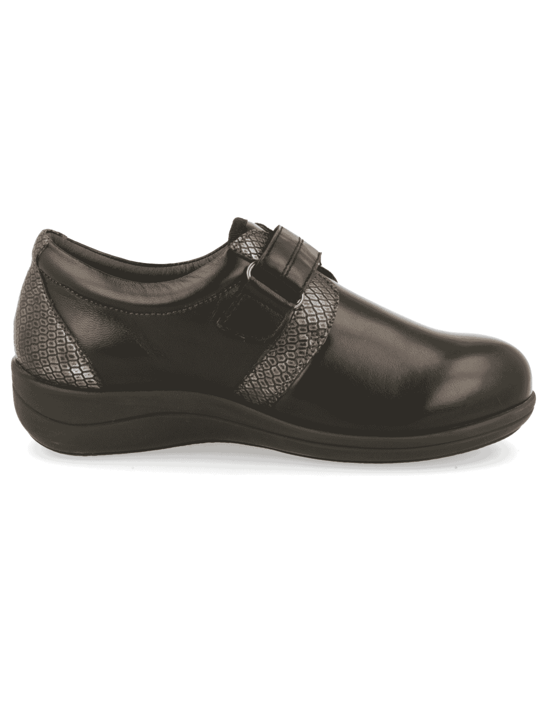 SENSITIVE FEET WOMEN SHOES, LARA 01 BLACK, leather and lycra elastic adaptable. Adjustment with strap on the instep. Suitable to adapt custom insole , manufactured with the best quality materials. Indicated for women who need a shoe comfortable, spacious and adaptable. Seams internal are protected, avoiding chafing and protecting the most sensitive and delicate feet. New Polyurethane pivots non-slip sole: provides lightness, stability and flexibility under foot.