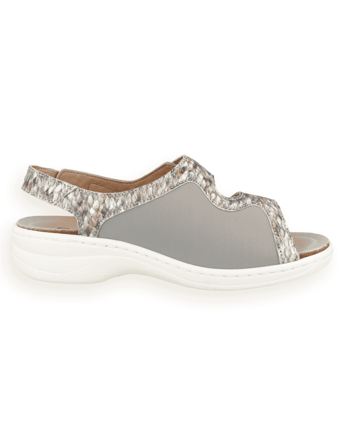 SANDALIA JULIA 2026 GRIS MULTI piel y licra elastica adaptable. Ajuste talón y empeine con tira velcro. Apto para adaptar plantillas a medida, fabricados con los mejores materiales de primera calidad. Indicado para mujeres que precisan un calzado cómodo, amplio y adaptable. Las costuras internas están protegidas, evitando rozaduras y protegiendo los pies más sensibles y delicados.