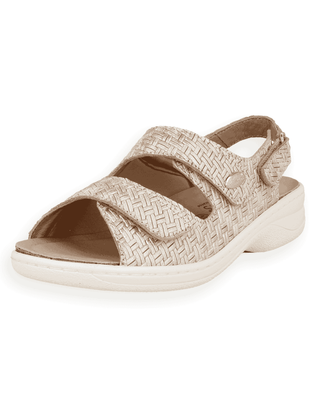 SANDALIA JULIA 2026 CHAMPAGNE piel y licra elastica adaptable. Ajuste talón y empeine con tira velcro. Apto para adaptar plantillas a medida, fabricados con los mejores materiales de primera calidad. Indicado para mujeres que precisan un calzado cómodo, amplio y adaptable. Las costuras internas están protegidas, evitando rozaduras y protegiendo los pies más sensibles y delicados.