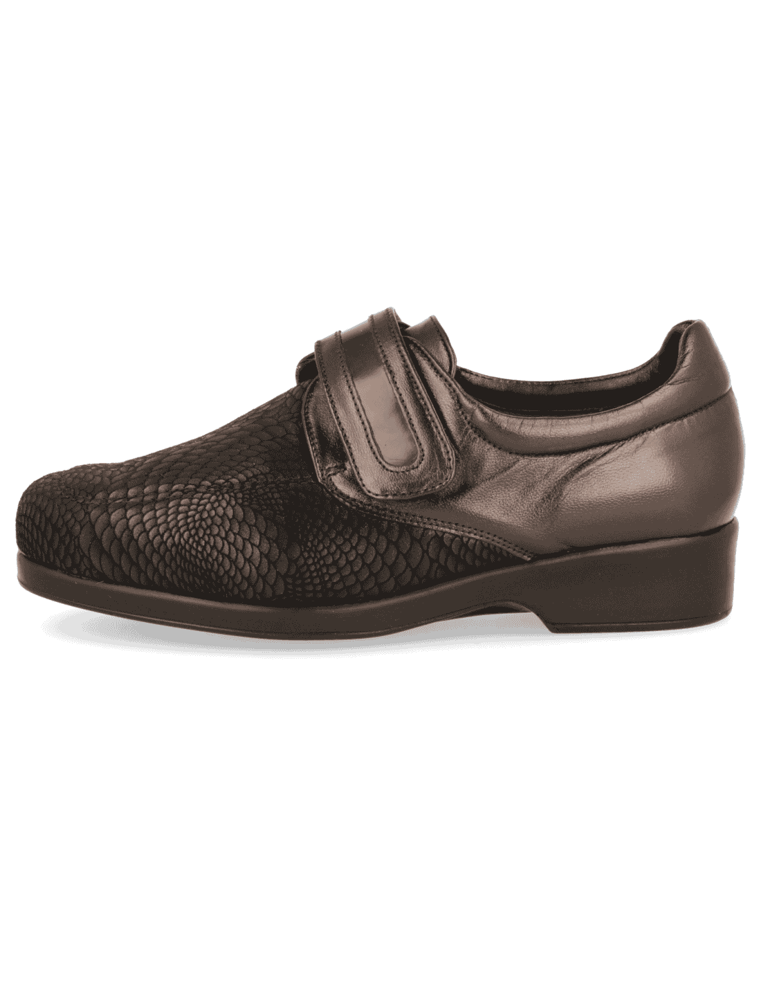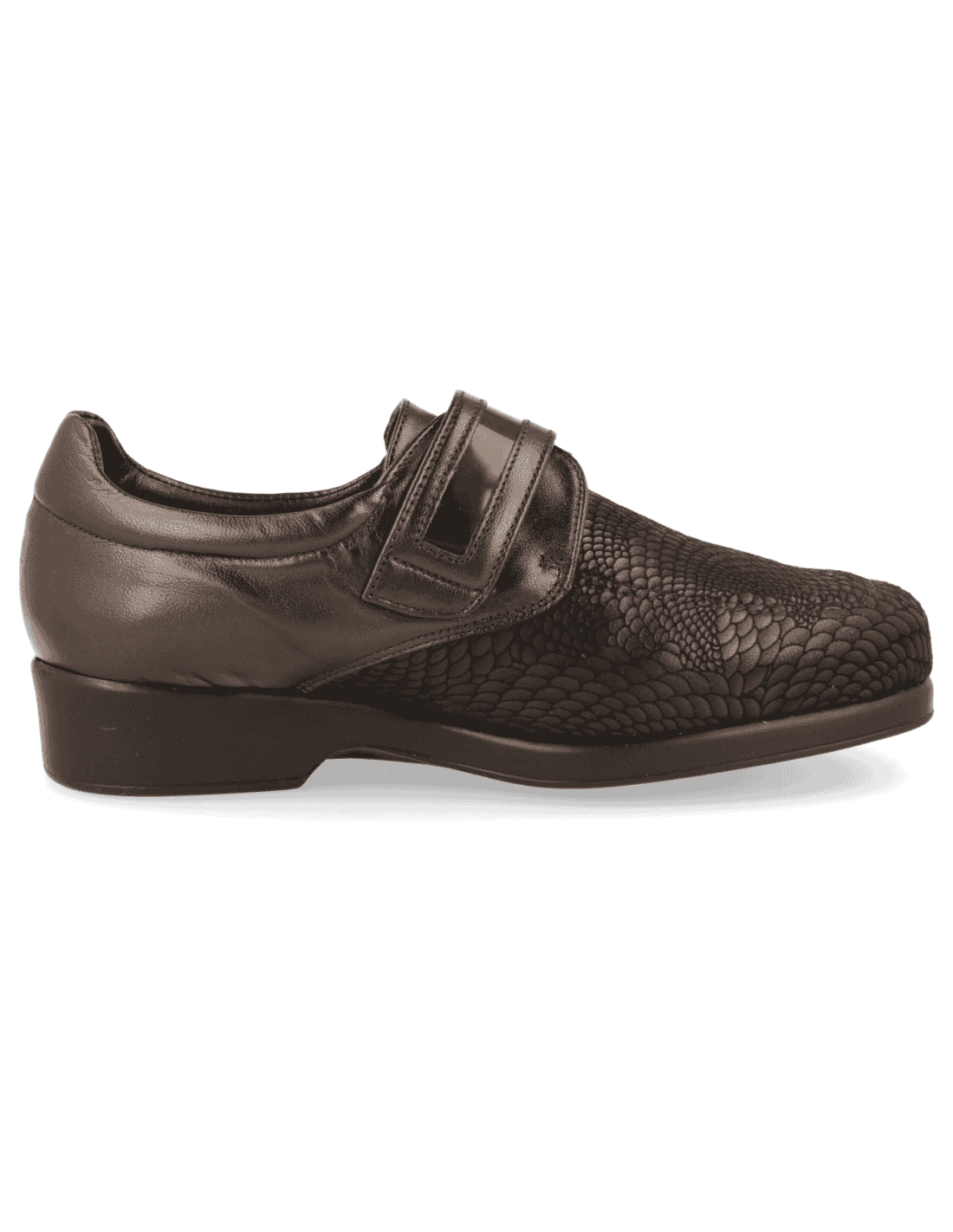 ZAPATO SEÑORA COMODÓN VIVENTY MARRÓN, piel y licra elástica adaptable. Ajuste con tira de velcro en empeine. Apto para adaptar plantillas a medida, fabricados con los mejores materiales de primera calidad. Indicado para mujeres que precisan un calzado cómodo, amplio y adaptable. Las costuras internas están protegidas, evitando rozaduras y protegiendo los pies más sensibles y delicados.