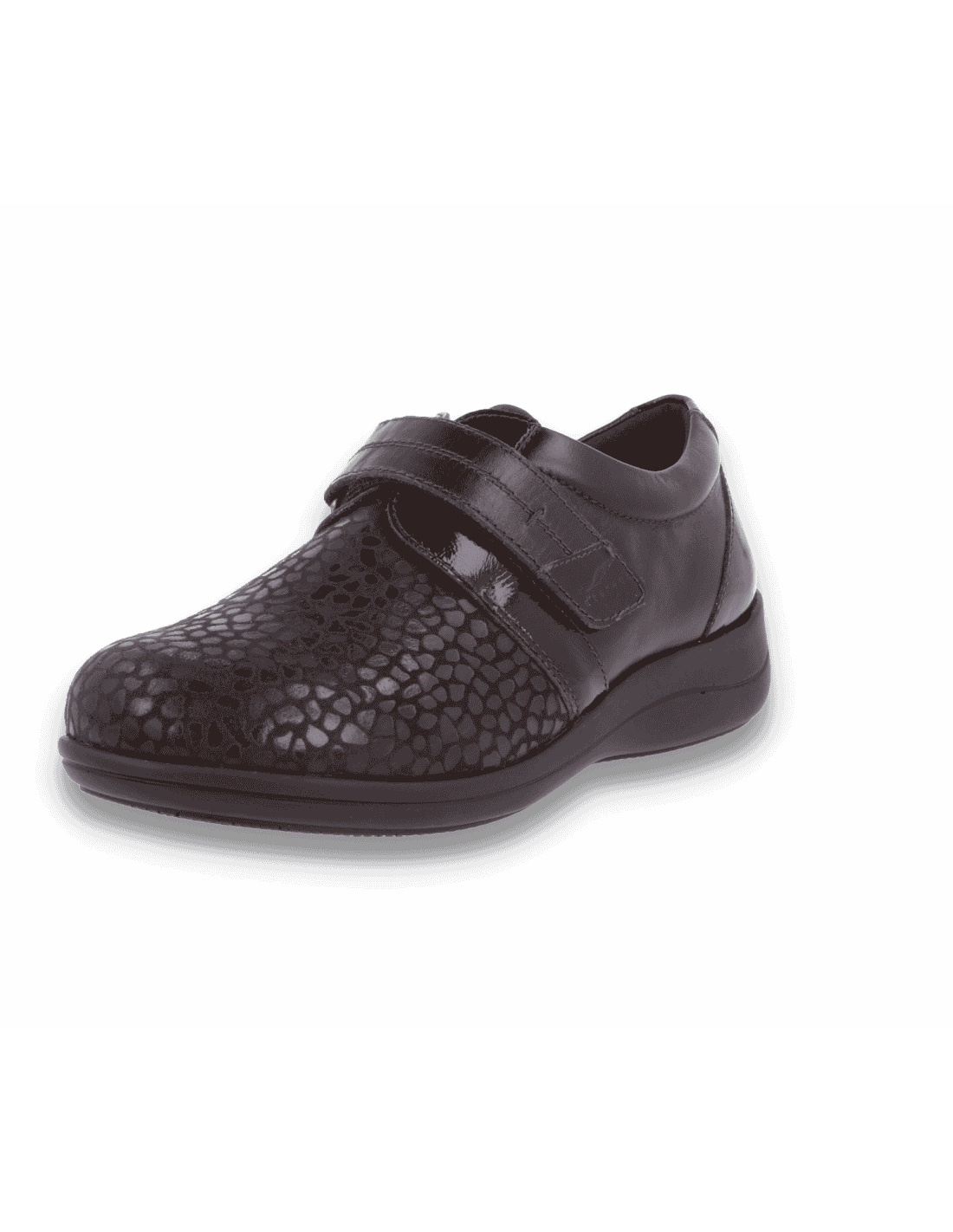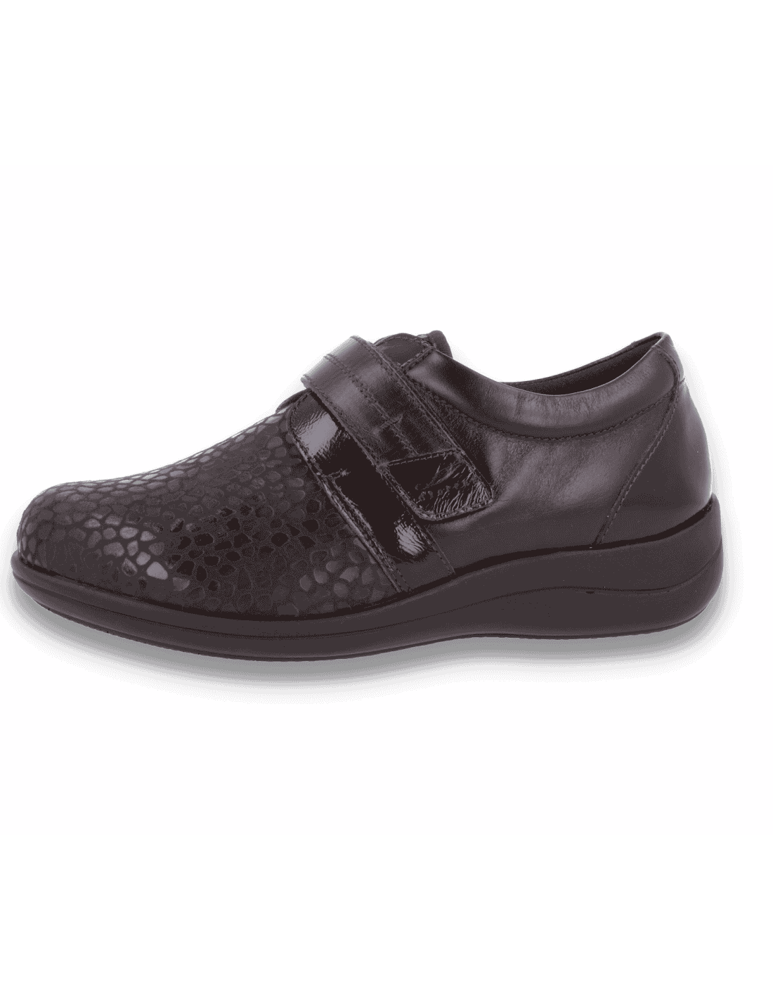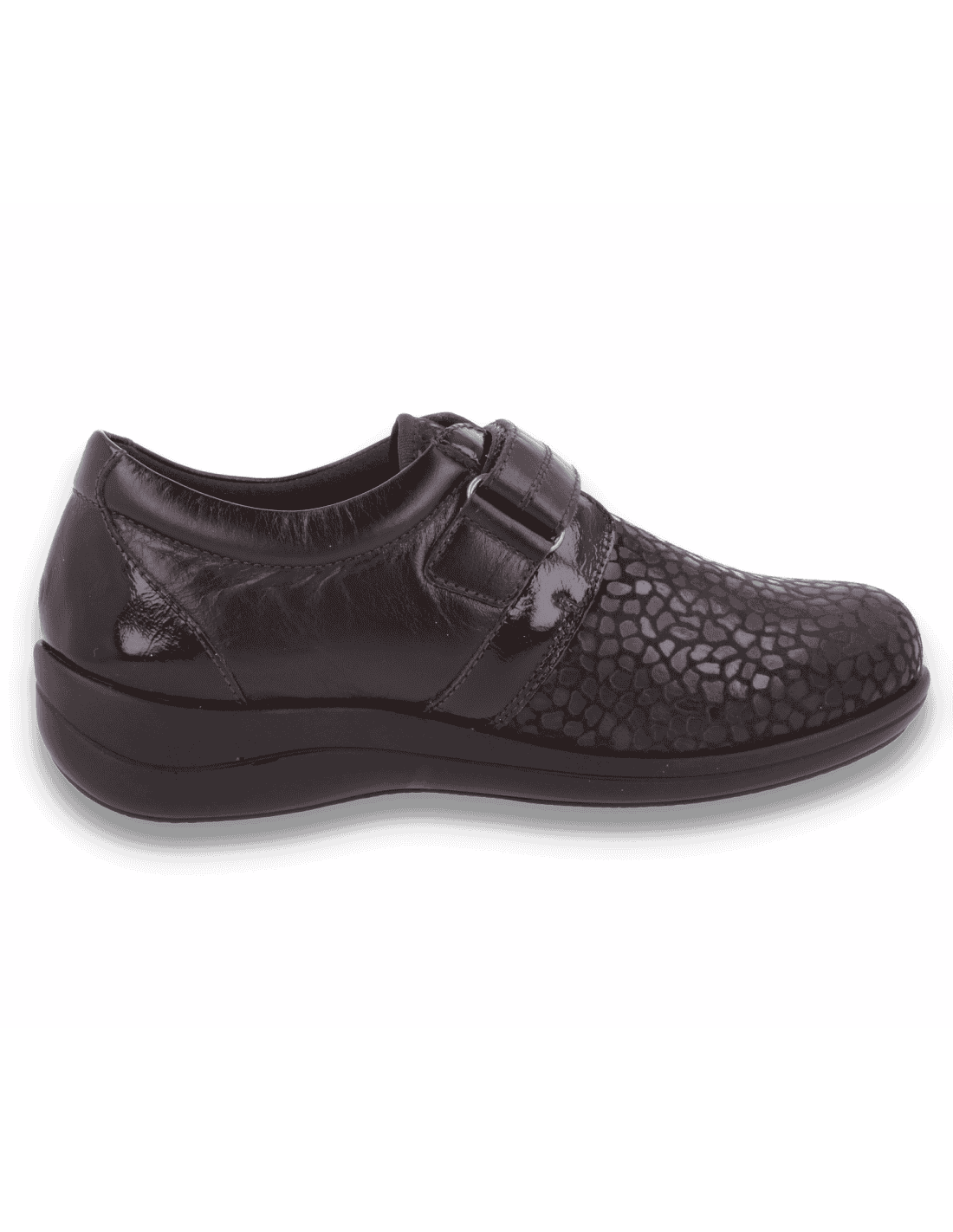 - Corte : Zapato de señora de diseño actual, fabricado en piel adaptable de vacuno, y licra, que fusiona la elegancia con el máximo confort y adaptabilidad. Las costuras internas estan protegidas, evitando roces o erosiones en pies sensibles.