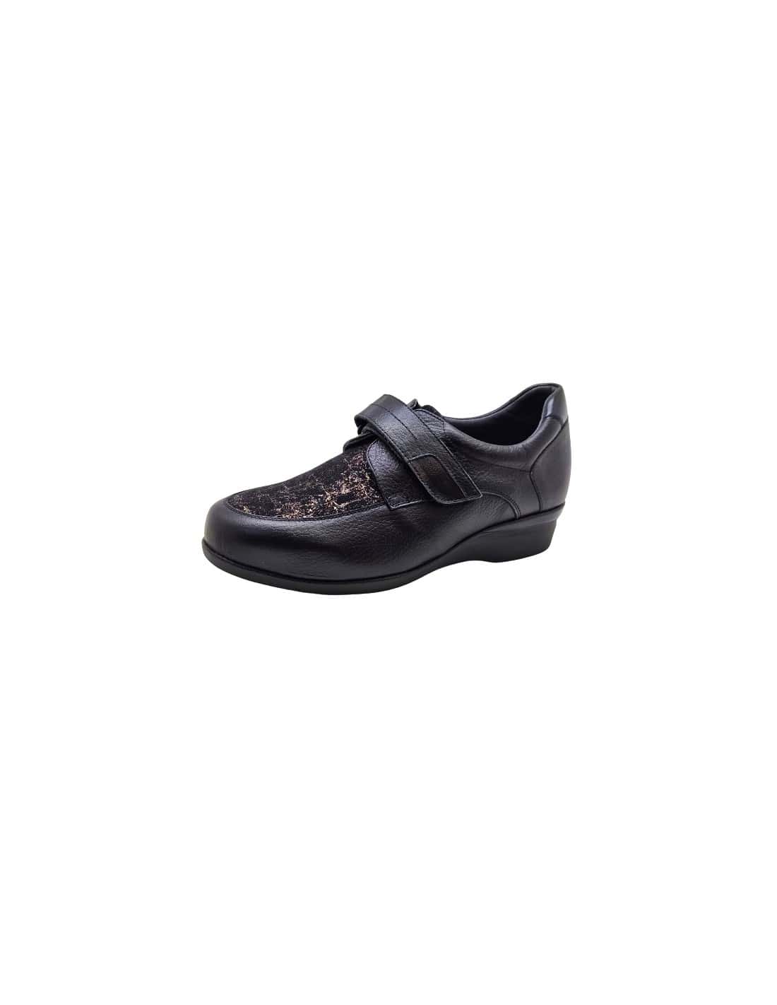 - Corte : Zapato de señora de diseño actual, fabricado en piel adaptable de vacuno, y licra, que fusiona la elegancia con el máximo confort y adaptabilidad. Las costuras internas estan protegidas, evitando roces o erosiones en pies sensibles.