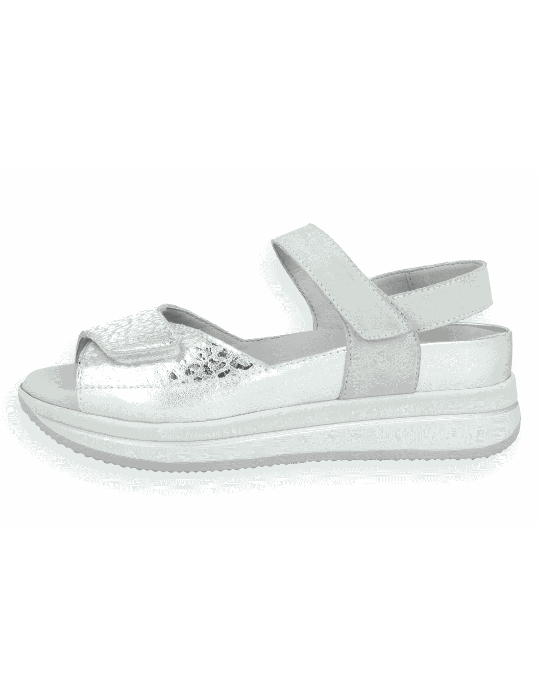 SANDALIA SEÑORA IZMIL PLATA ORO, piel adaptable. Ajuste con velcro en empeine,. Apto para adaptar plantillas a medida, fabricados con los mejores materiales de primera calidad. Plantilla anatómica de poliuretano acolchada de gran confort. Indicado para mujeres que precisan un calzado cómodo, amplio y adaptable, y que que pasan muchas horas caminando.