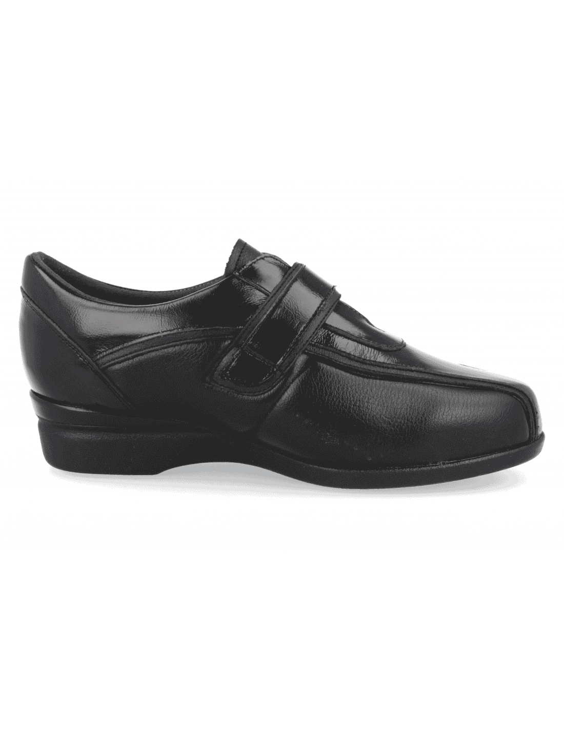 ZAPATO SEÑORA CASANDRA 2023 01 NEGRO, piel y licra elástica adaptable. Ajuste con tiras de velcro en empeine. Apto para adaptar plantillas a medida, fabricados con los mejores materiales de primera calidad. Indicado para mujeres que precisan un calzado comodo, amplio y adaptable. Las costuras internas estan protegidas, evitando rozaduras y protegiendo los pies más sensibles y delicados.