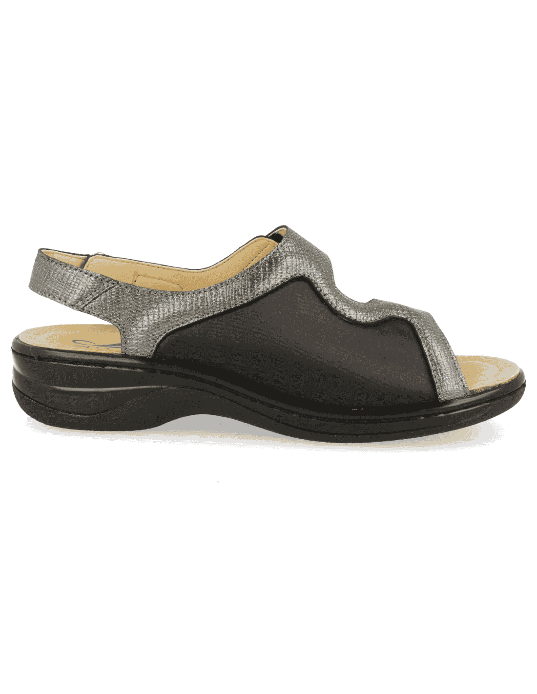 SANDALIA DENIA PLOMO fabricada con piel adaptable. Ajuste empeine con hebilla ,fabricados con los mejores materiales de primera calidad. Indicado para mujeres que precisan un calzado cómodo, amplio y adaptable. Las costuras internas están protegidas, evitando rozaduras y protegiendo los pies más sensibles y delicados.